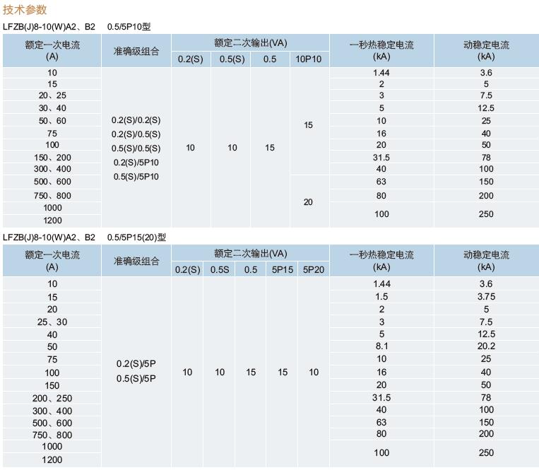 二、LFZBJ8-10A2、LFZB8-10B2穿墻式電流互感器技術參數